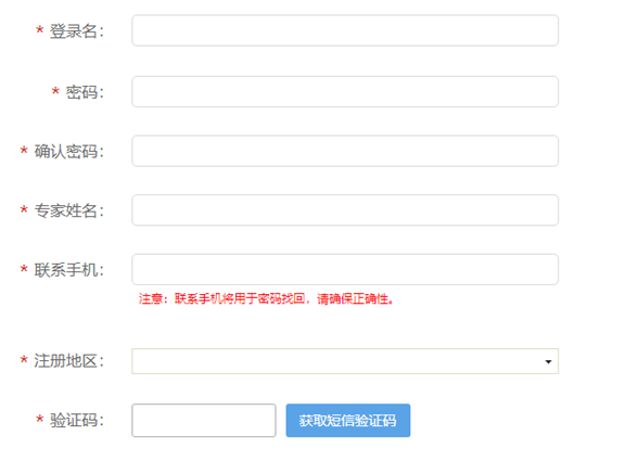 4.在专家注册页面,据实填写完善相关信息并获取验证码,点击